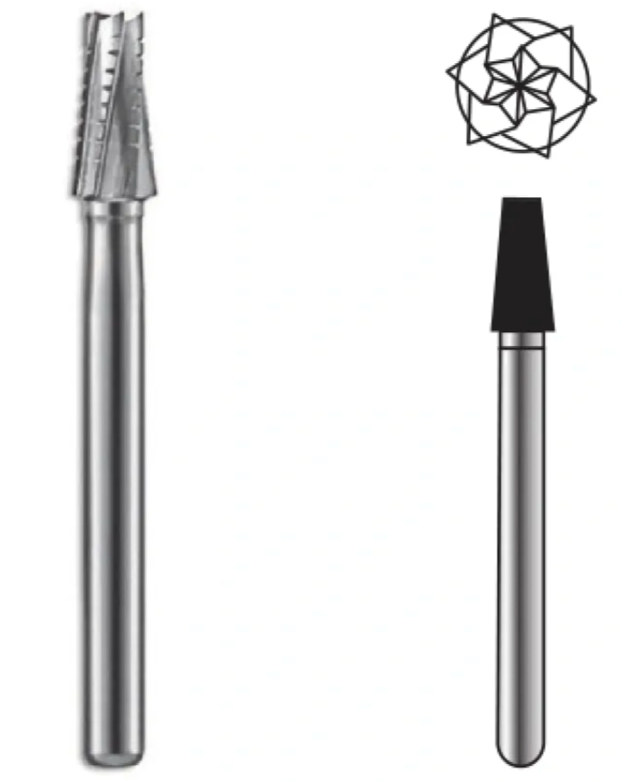 Designed for preparation with diverging walls; create shoulders and tapered walls. Ideal for ceramic crown preparations. Crosscuts provide smoother cutting and improve cutting efficiency. Dome Ends create rounded internal corners.